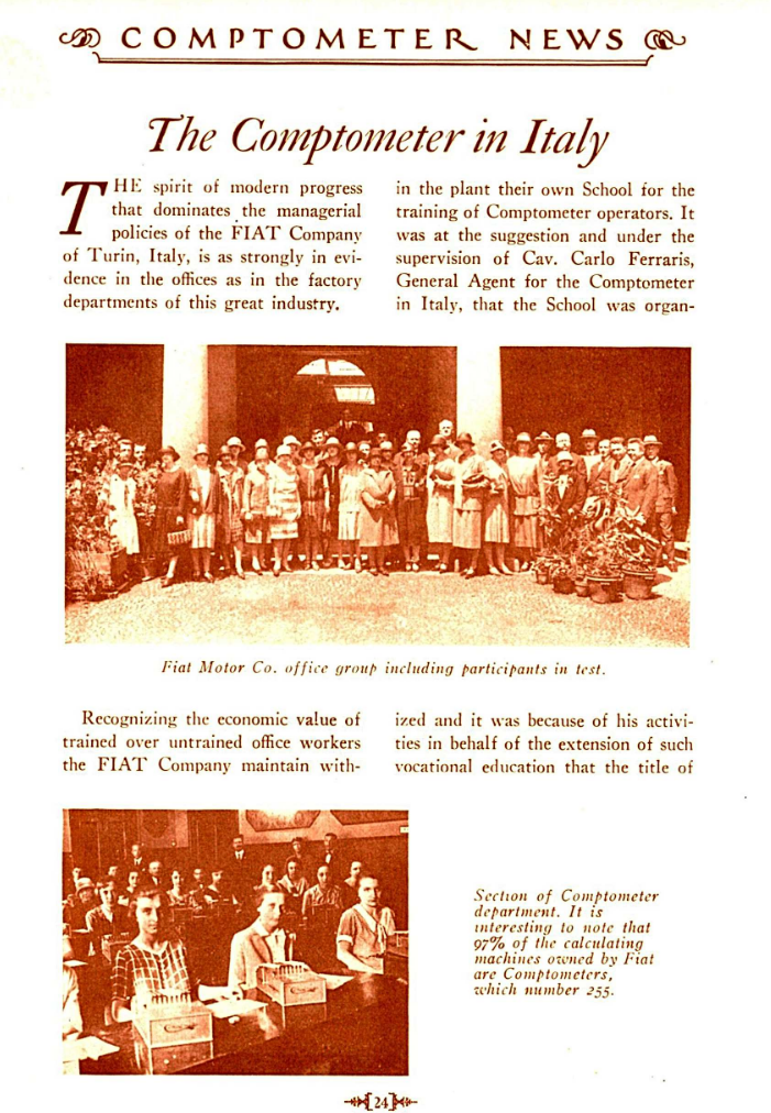 Article found in Comptometer News, December 1926, about a comptometer competition organized by FIAT in Italy. Comptometrist was almost exclusively a female job. Source