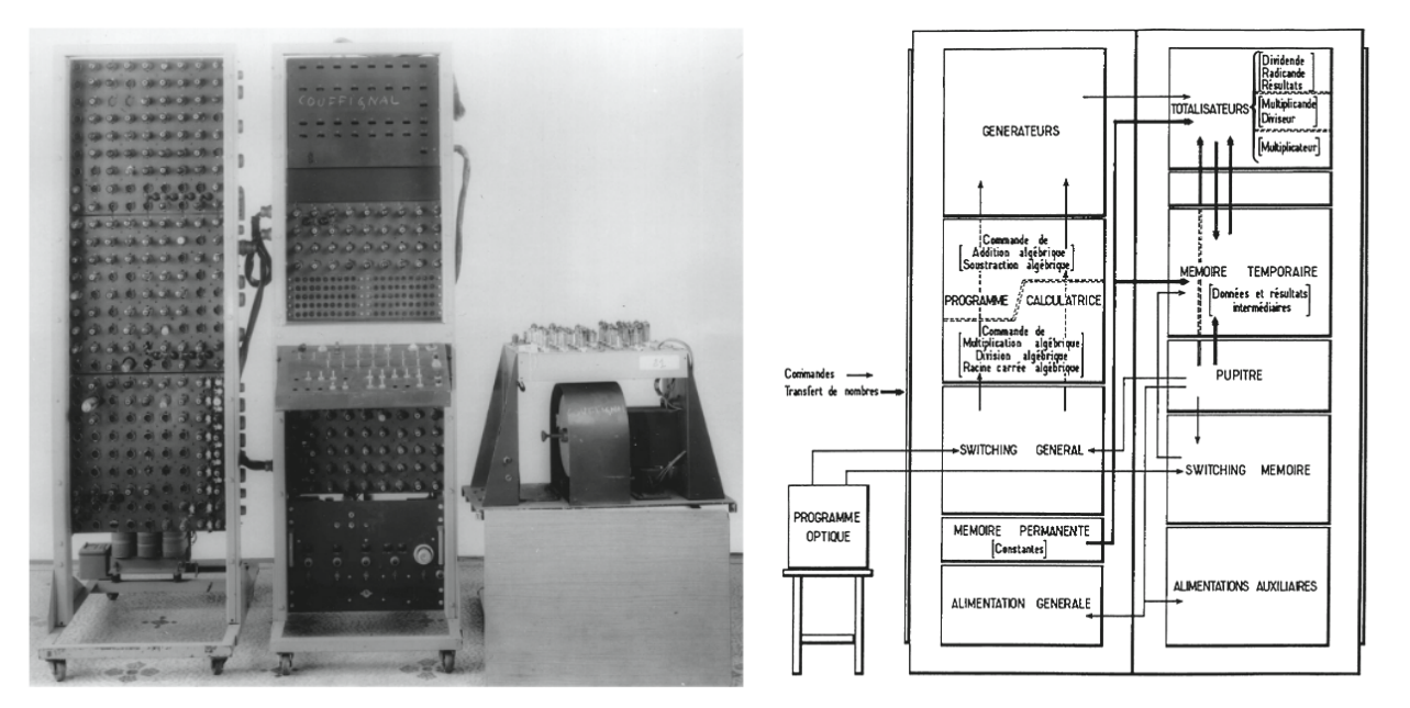 The “pilot” of the Couffignal machine and its inner organisation. Note the different areas of the machine in charge of the different types of calculations. Source: Pierre-Eric Mounier-Kuhn’s Histoire de l’Informatique en France