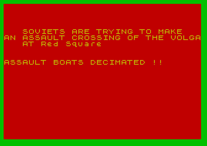 Edit: Commenter LanHawk then found another by John Minson in Popular Computing Weekly, 18th April 1985. The game receives 3 stars with the following comment: “it’s best suited not to the general computer gamer but the cardboard general could find it a satisfyingly different experience to die rolling.” The review also mentions crashes on wrong inputs that I did not encounter.