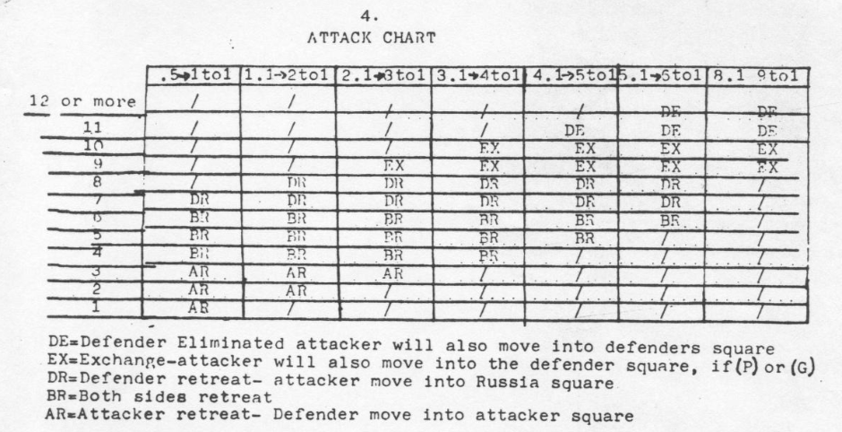 The only input the player has is movement and can only be done horizontally and vertically (up to 2 squares for infantry, 3 for tanks). When a unit is in contact with an enemy – including on a diagonal – it is stuck there until combat resolution – during which each Axis unit in contact with a Russian unit automatically picks one unit to attack – the combat is solved thanks to a Combat Result Table (CRT).