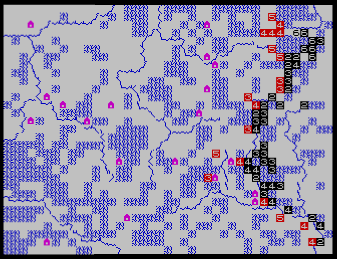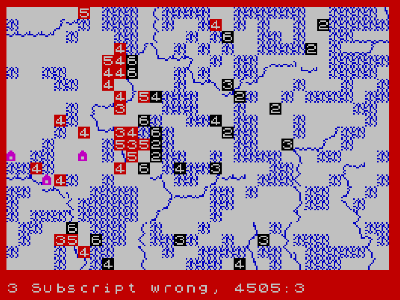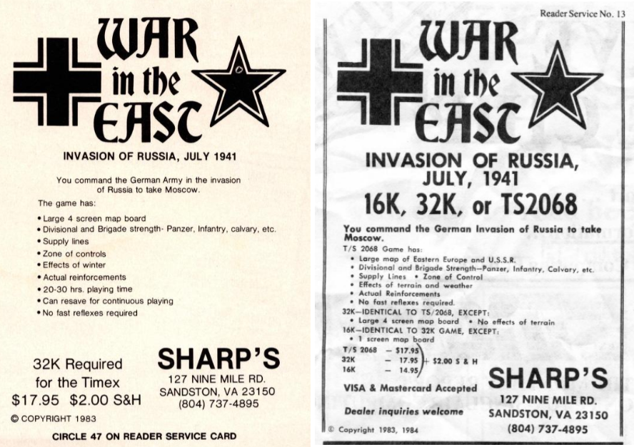 Unfortunately, a lot has been lost. Stueber eventually moved from Sandston to Mechanicsville and created Sharp’s Computer Center, a shop that specialised in Timex computers until long after its prime. Its 1986 catalogue listed a Fall of Rome and a Redcoats, both lost. Additionally, War to the East was clearly modified year after year, and eventually the 1986 version for Sinclair QL included 4 different scenarios on a large 4-screen map – a far cry from the mediocre 16K version – which I would have been interested to play. In March 1987, Stueber claimed to have sold 4000 copies of War to the East – all versions included.