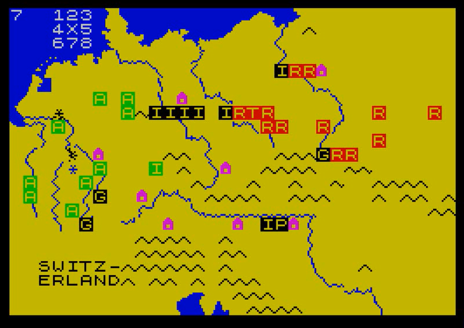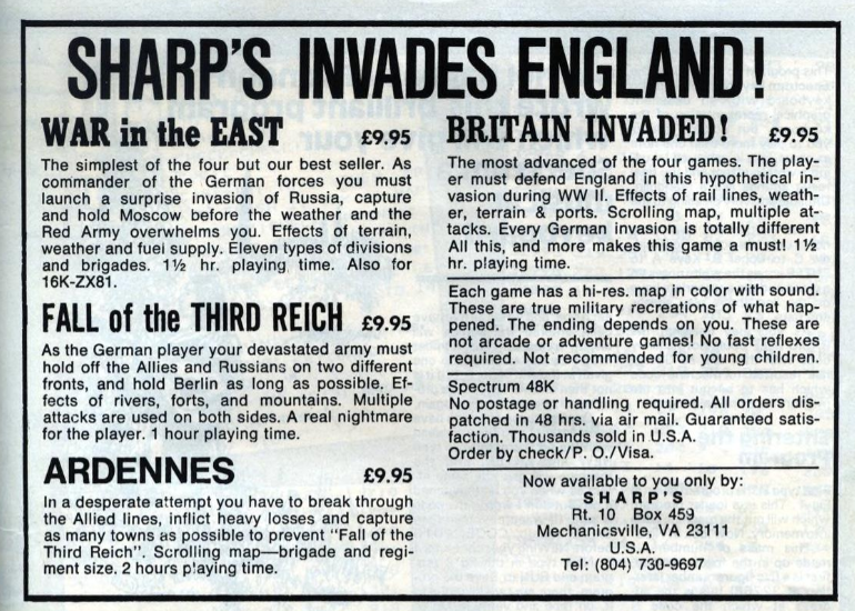 Context – Today’s games are the brainchild of Mark L. Stueber. Somewhere in the early 80s, Stueber had bought a grocery store from a man called Emmet Sharp and decided to keep the name. Passionate about his Timex T/S 1000 (an official ZX81 clone made for the US market), Stueber sold his first wargame War to the East from his store in 1983, then upgraded to Timex T/S 2048 (a Spectrum clone), for which he updated War to the East and created Fall of the Third Reich in 1984. He finally added Ardennes to the collection in either 1984 or 1985. As for Britain Invaded!, it was initially exclusive to the Spectrum and so was probably coded in 1985, just as Sharp’s invaded the British market with ads in ZX Computing from April 1985 onward.