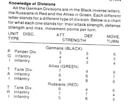 Instead of using a letter-code, Ardennes use numbers (the units’ strength), with the manual indicating that for the Germans, the 3 and 6 are armored and the 2 and 4 infantry.