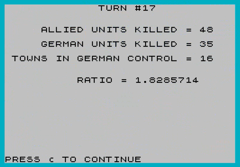 With 48 destroyed Allied units and 16 towns under my control, the Allied had to improve their score by 5 to force me below the 1.6 threshold, and only 3 of my units were really at risk. Therefore, I chalk that as a win, and I am not replaying this game a second time.