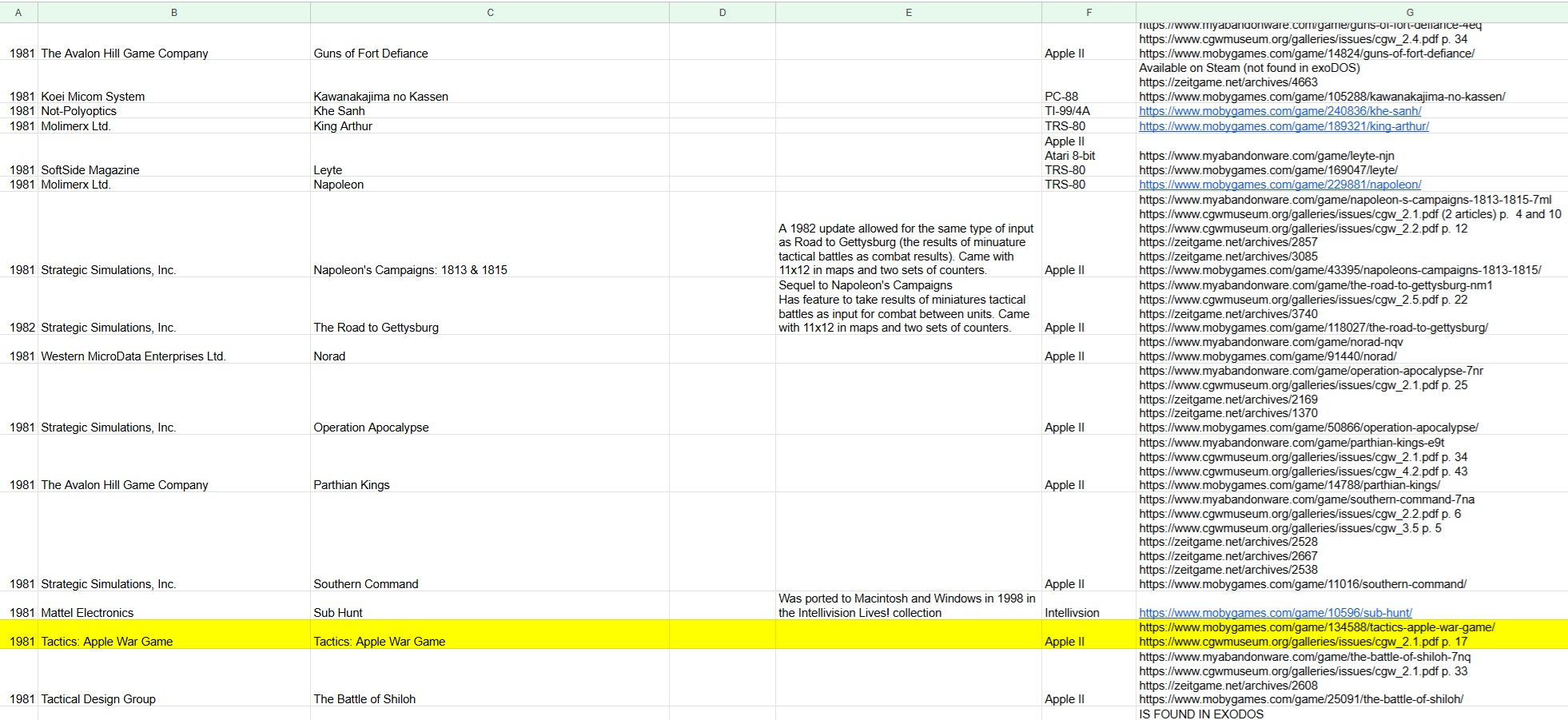 • It is complete until 1985 only. Some games still require investigation and could be removed from the list. On the other hand, if you believe there are wargames that I have missed, feel free to suggest them in the comments section. You can also report any inaccuracies regarding dates, platforms, or other details for the games I have documented.